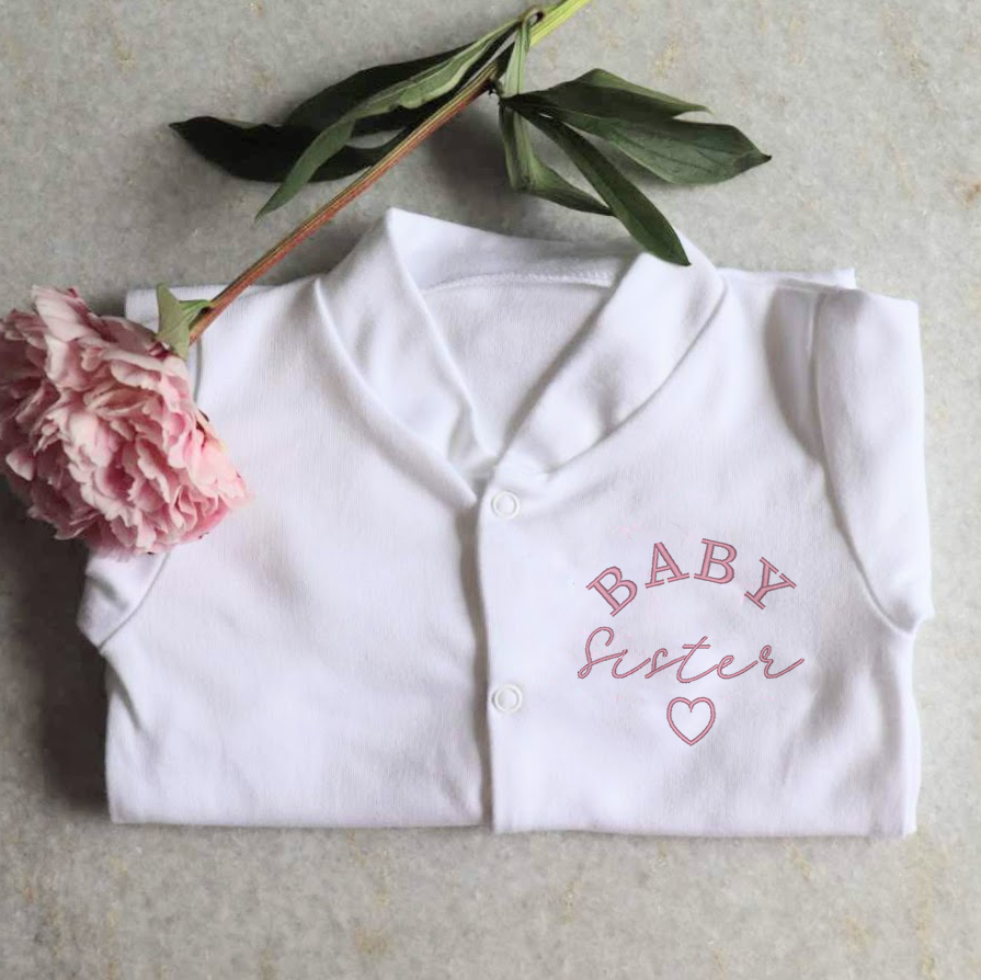 Introducing our Baby Sleepsuit, embroidered with the words "baby brother" or "baby sister" on a curved design. Made from soft and comfortable fabric, this sleepsuit is perfect for your little one's sleep time. Show off your little one's new sibling with this adorable sleepsuit.